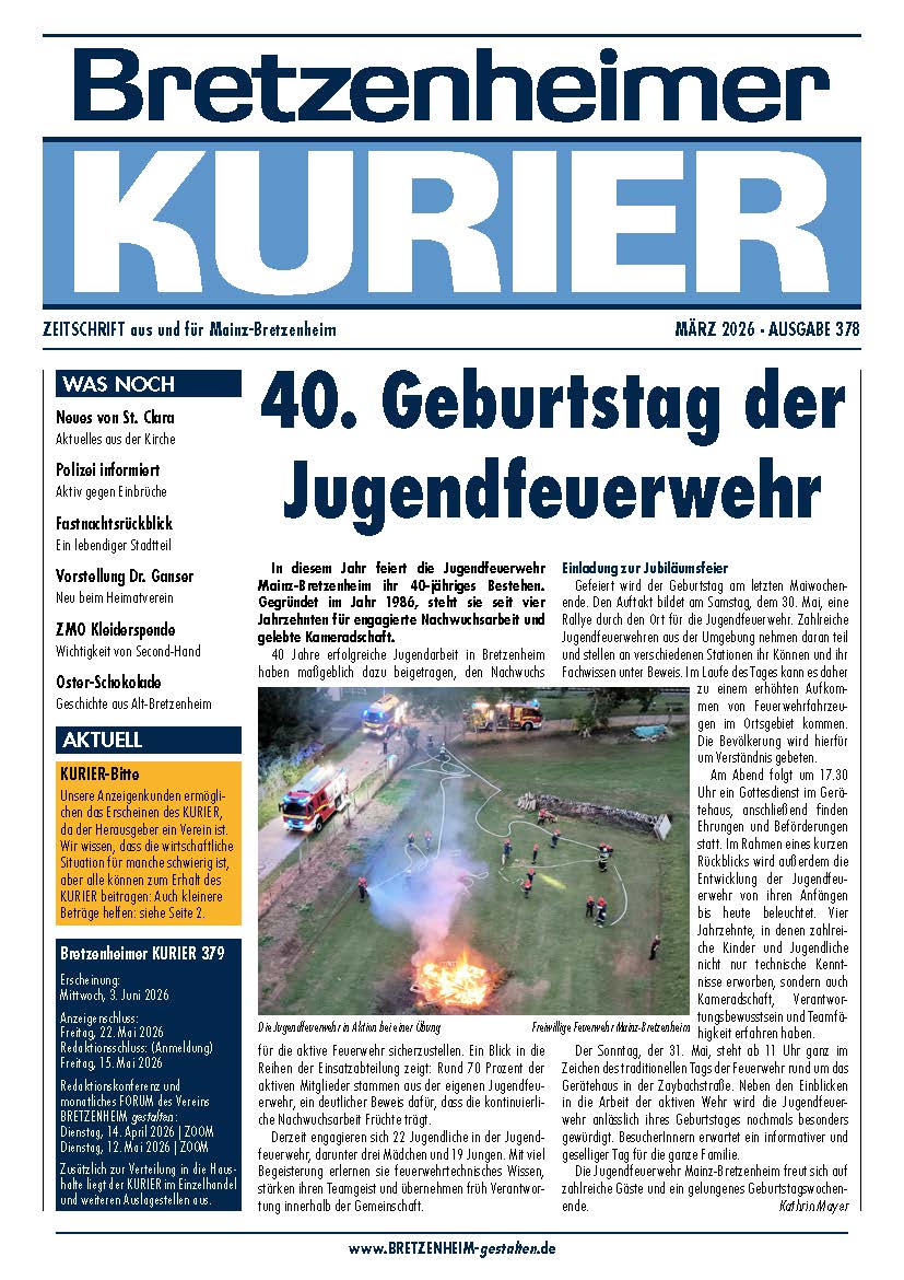 Der Verein BRETZENHEIM gestalten e.V. gibt 2-monatlich den Bretzenheimer KURIER heraus und lässt ihn in die Haushalte in Bretzenheim verteilen.